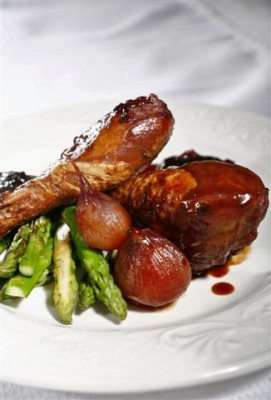 עופיון בדבש תמרים ולואיזה ממולא בקוסקוס, בצל מטוגן, משמש וזרש פרסי